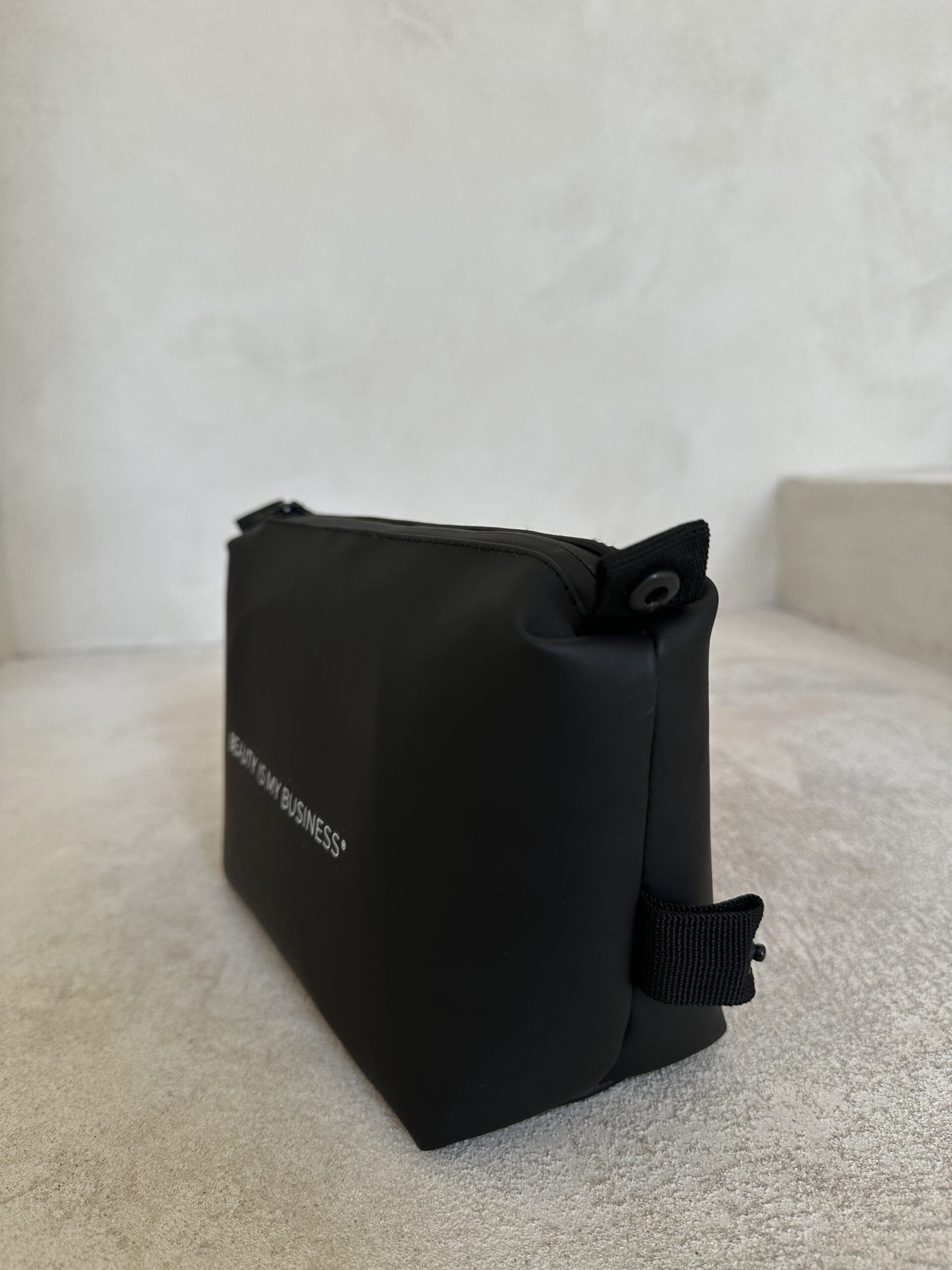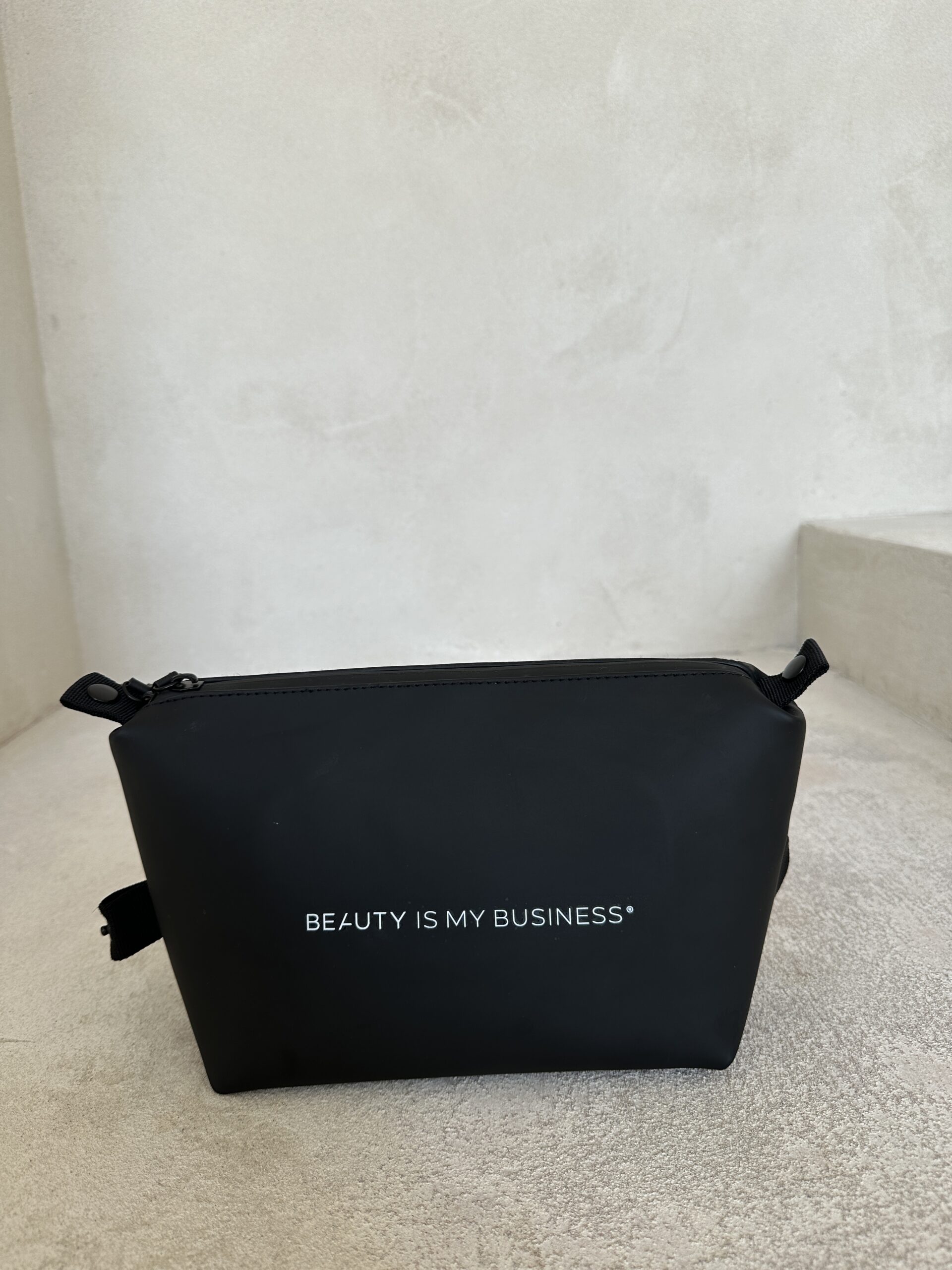 Minimalistyczna czarna kosmetyczka z napisem BEAUTY IS MY BUSINESS® – idealne rozwiązanie dla osób, które cenią sobie styl, funkcjonalność i najwyższą jakość. Kluczowe cechy naszej kosmetyczki:
